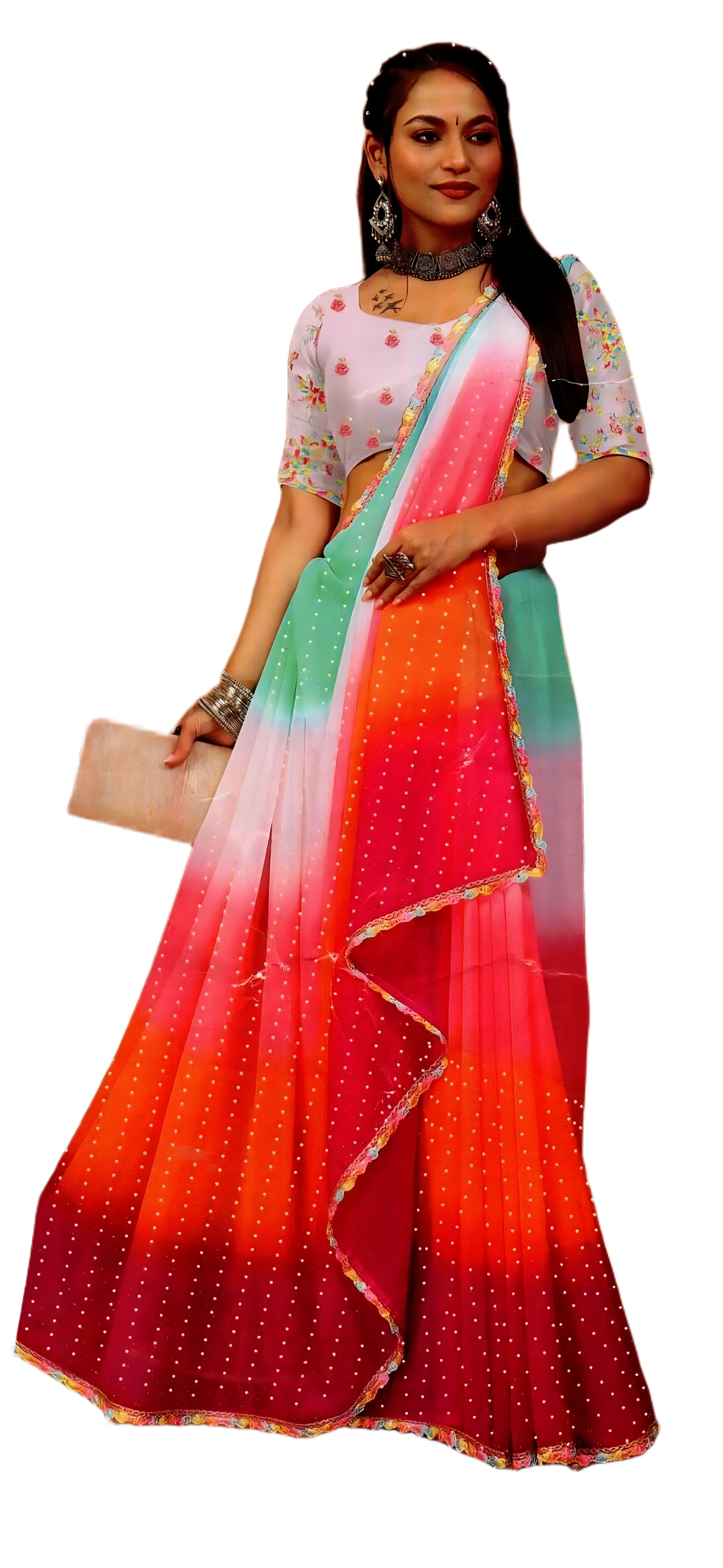 Elevate your ethnic wardrobe with this g... Elevate your ethnic wardrobe with this gorgeous multicolor georgette saree, designed to offer both style and comfort. The soft, airy georgette fabric drapes effortlessly, highlighting your grace and confidence. The saree features a beautiful blend of vibrant hues with an elegant embellished border, perfect for festive occasions, parties, and cultural events.